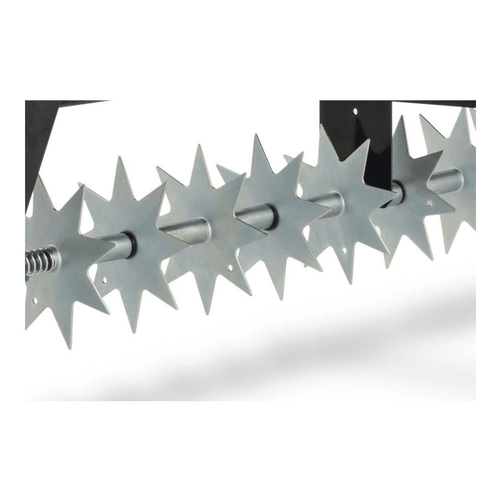 The Agri-Fab 45-0544 has an adjustable aeration depth up to 6.5cm and is supplied with 10 aeration discs that each contain 60 curved spikes. This is accomplished by stacking the weight tray with ballast. The star-shaped discs with spiked tips cut into the grass to allow essential nutrients, fertiliser, air, water, and light to reach the grass roots. When transferring from one lawn to another, the spikes can be elevated to a transport position.