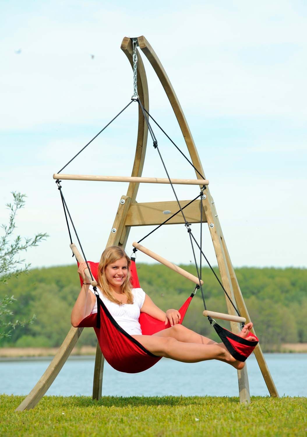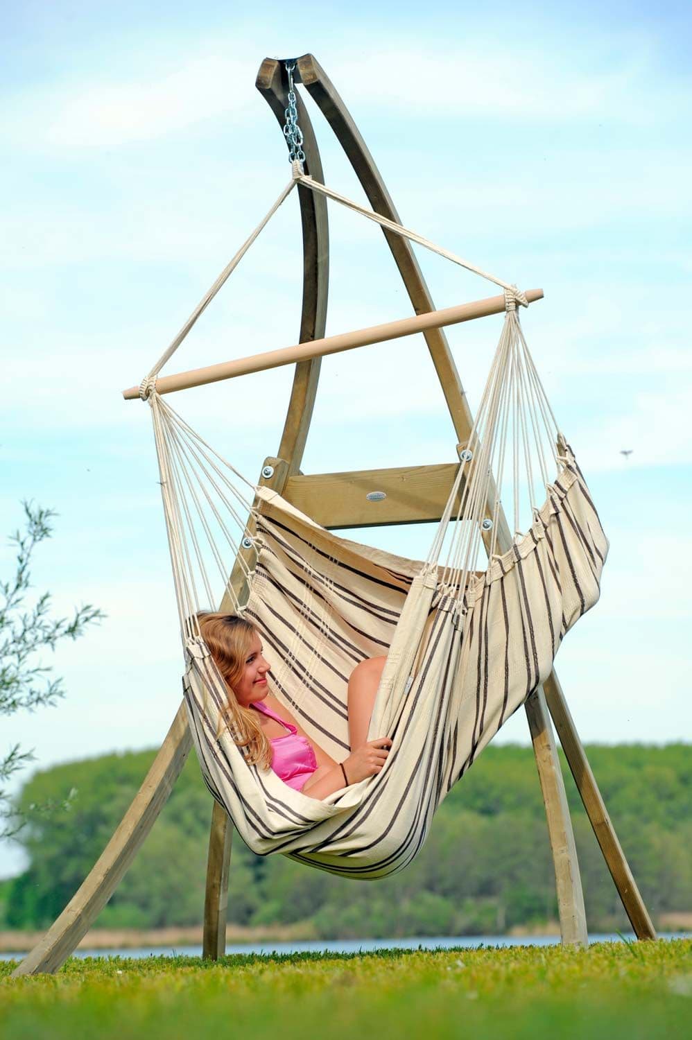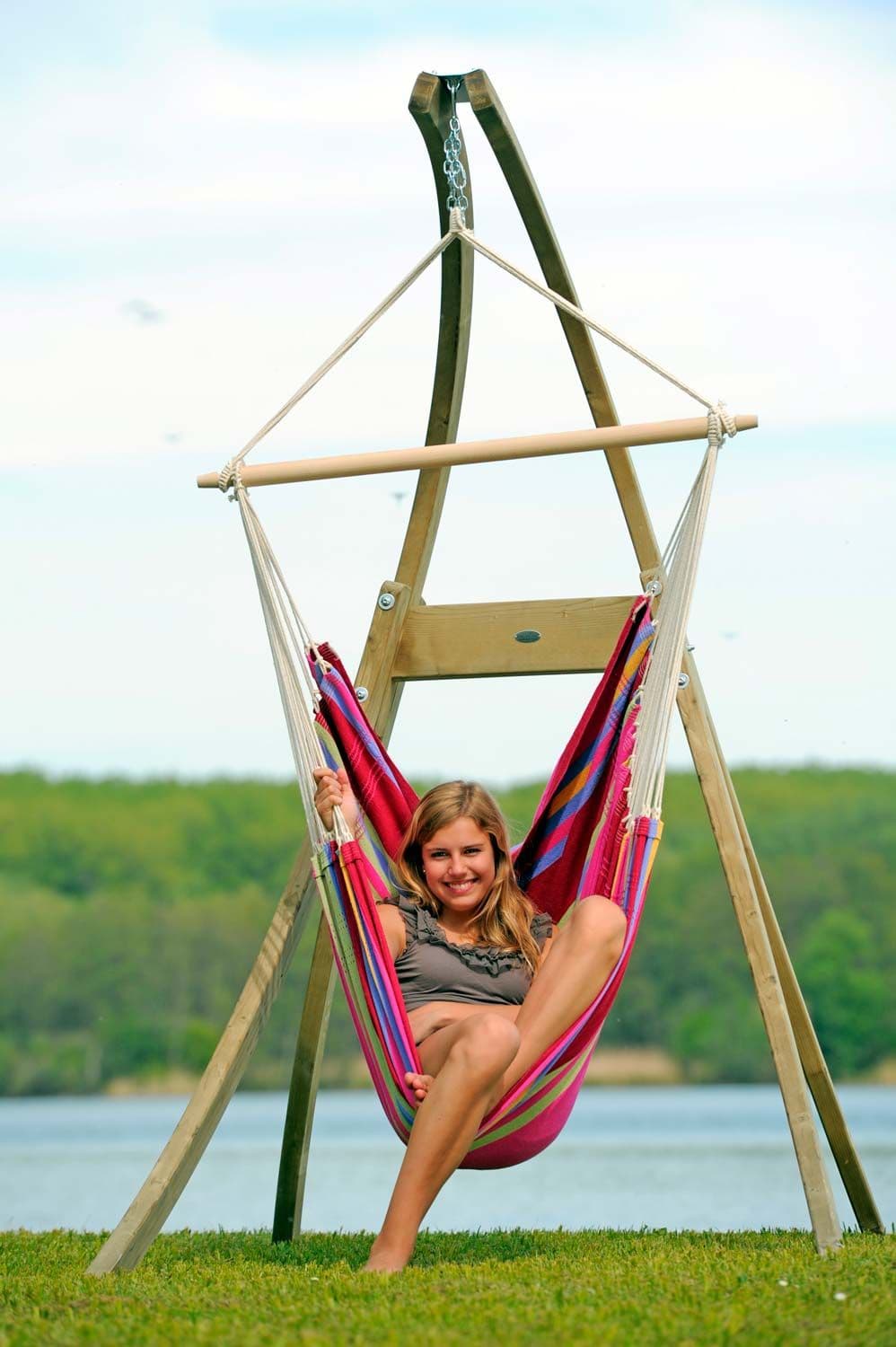 Because: This beautiful, strong stand is designed for the hammock chair and can be used inside or outside as it is made from weatherproof spruce.