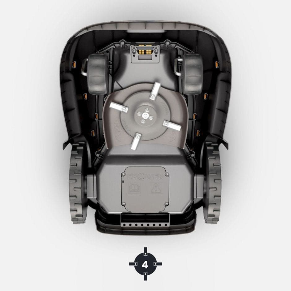 Excellent sound insulation keeps the motor noise to a minimum within the autonomous robot mower's outer shell. When it comes to maintenance and cleaning, the sturdy outer shell can be removed easily without the need of any tools and can be cleaned using a garden hose. If you need to clean the machine's body with a direct waterflow ensure to keep the robot in its working position (horizontal, wheels downwards). If you are just cleaning the blades, use a brush. Do not direct waterflow to the mower when upside-down.