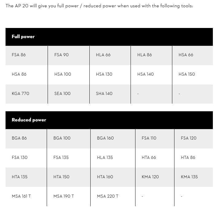 For a full list of STIHL battery-powered tool working times, click here. If the AP 20 is not recommended for your machine you will require the AP 200 S, 300 S or 500 S
