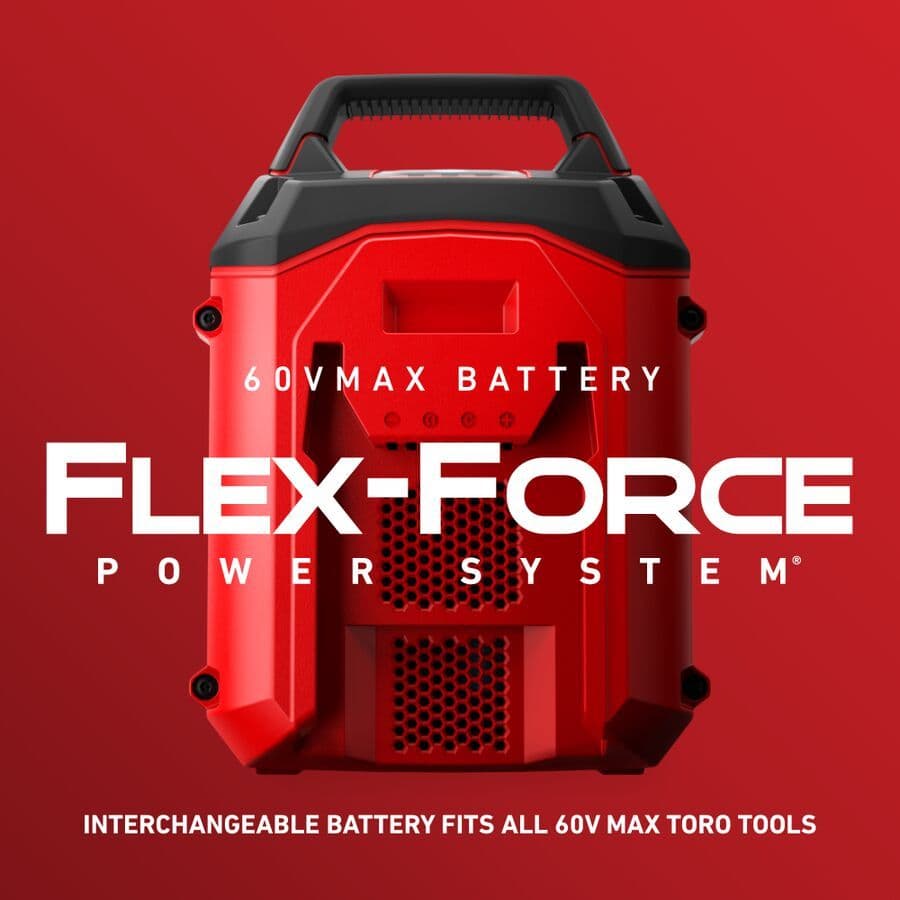 The Toro 60V* Flex-Force Power System® is the most powerful battery in its class. Period. It's the one battery you need to finish everything without sacrificing anything. It offers the ultimate innovation with our "3P" configured stack for 3 times the power, higher max performance, and the ability to push your tools harder, for longer. It’s flexible enough to work across a full line of unbeatable Toro tools from handheld trimmers and edgers all the way up to the biggest and baddest in our lineup, including America’s #1 mower and snow blower brand. From tool to tool to tool, done and done and done. It’s 60 volts of all the things you want from a battery: Easier. Faster. Cleaner. Greener. Quieter. No cords. No mess. No hassles. Virtually no maintenance. That's power without compromise.